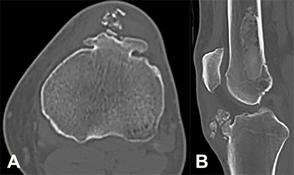 La tomografía computada (TC) reveló una lesión exofítica de contornos irregulares, dependiente de la TAT. Algunas de estas calcificaciones eran subyacentes al TR y otras impresionaban intratendinosas. Además, se observó una imagen endomedular, de contornos netos escleróticos, con patrón de vidrio esmerilado, con contacto con la cortical posterior, sin causar reacción perióstica, ubicada en el sector diafiso-metafisiario distal del fémur (fig. 3).