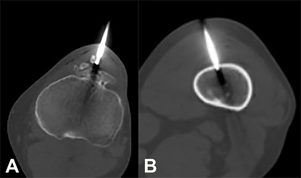 Figura 5: Se observa el sitio de la biopsia guiada bajo TAC en un corte axial de la tibia (5a) y del fémur (5b).
