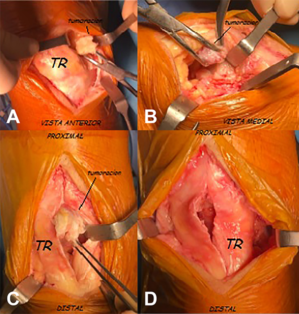 Figura 6: Imágenes intraoperatorias. Resección vista anterior (a) y medial (b) al TR de la tumoración. Luego de la incisión longitudinal del TR se liberó y resecó el tercio medio de la tumoración (c) hasta su resección completa, preservando la totalidad del TR (d).