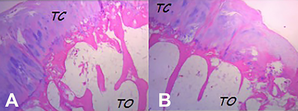 Figura 7: Imagen histológica de la anatomía patológica en la que se observa una proliferación osteocartilaginosa sin atipias. TC: tejido cartilaginoso; TO: tejido óseo.