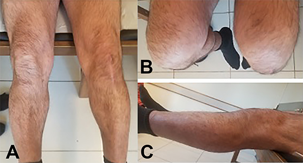 Figura 8: Evolución clínica de frente (a), superior (b) y perfil (c) a tres meses postoperatorio donde se observa la ausencia de la protuberancia a nivel de la TAT (tuberosidad anterior de la tibia).