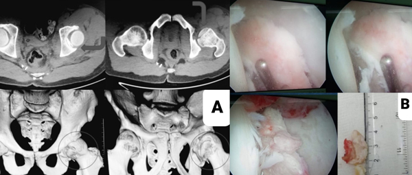Figura 1: A) Imagen de TC corte axial (arriba) y 3D (abajo), obsérvese fragmento osteocondral intraarticular, fractura de la cabeza femoral Pipkin I. B) Imagen de artroscopía de cadera donde se observa fragmento intraarticular de 2 x 1 cm (inferior derecha).