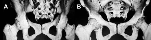 Figura 2: A) Imagen de TC3D donde se observa pequeño defecto de la ceja acetabular posterior. B) Imagen de TC3D donde se observa fractura de Pipkin I cadera izquierda consolidada.