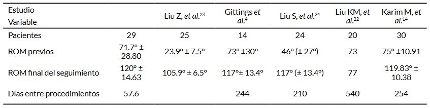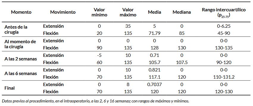 El rango de movilidad (ROM) fue evaluado de forma seriada por el equipo tratante mediante goniometría estándar en las consultas clínicas programadas. El ROM medio preoperatorio fue de 71.8° (rango: 20°– 135°). En el postoperatorio inmediato se obtuvo un ROM medio de 128.0° (rango: 90°–135°), y a las 16 semanas fue de 120° (rango: 70°–135°) (Tabla 1).