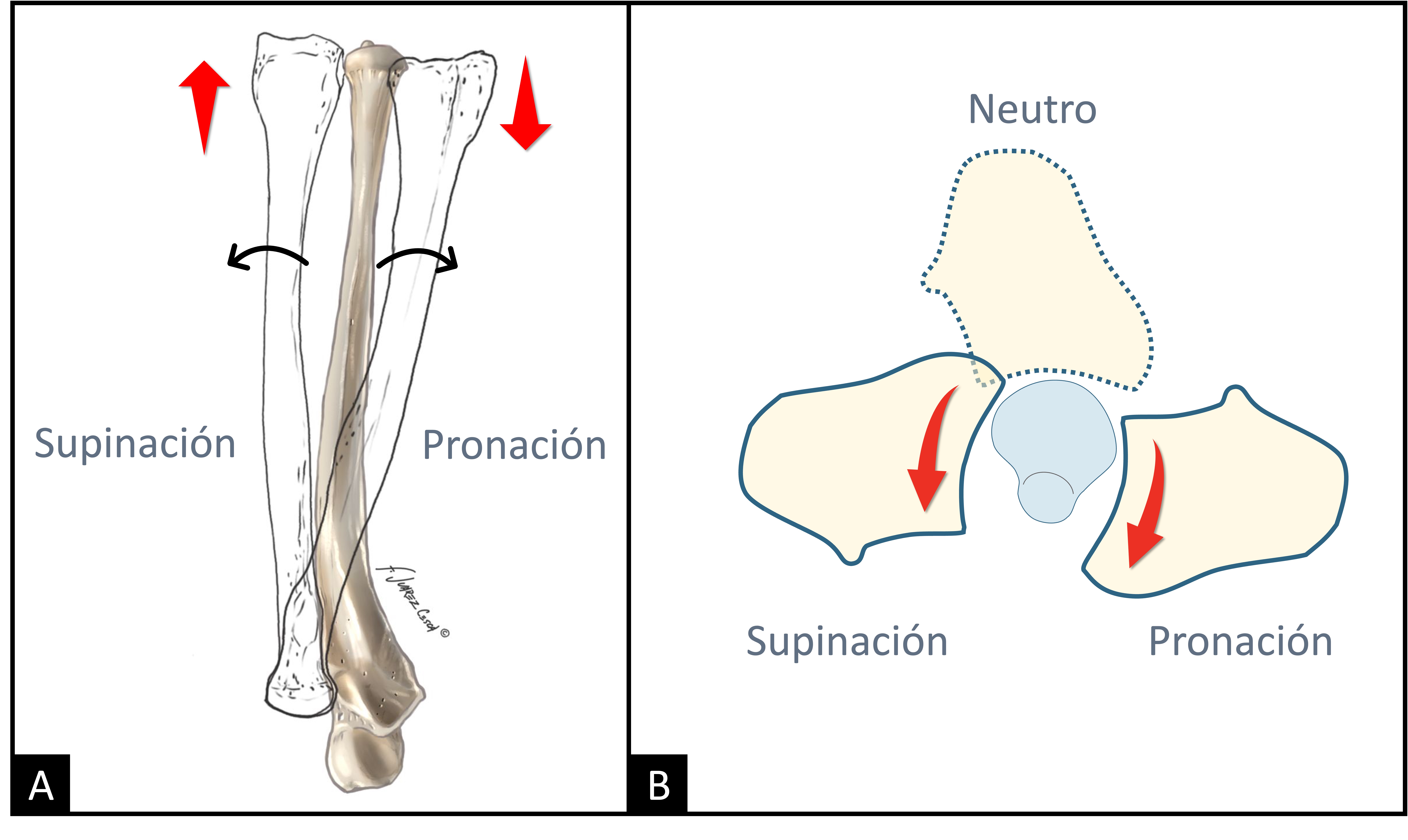 Figura 1. Los 3 movimientos de la articulación RCD. A) A medida que el radio rota de supinación completa a pronación completa alrededor de un cúbito fijo, debe acortarse con respecto al cúbito, lo que provoca un aumento progresivo de la varianza cubital. B) Debido a la geometría de los huesos, en la que la base de la cabeza cubital es menor que el arco correspondiente de la escotadura sigmoidea, durante la rotación se produce una traslación anteroposterior en el radio: traslación volar en pronación, traslación dorsal en supinación.