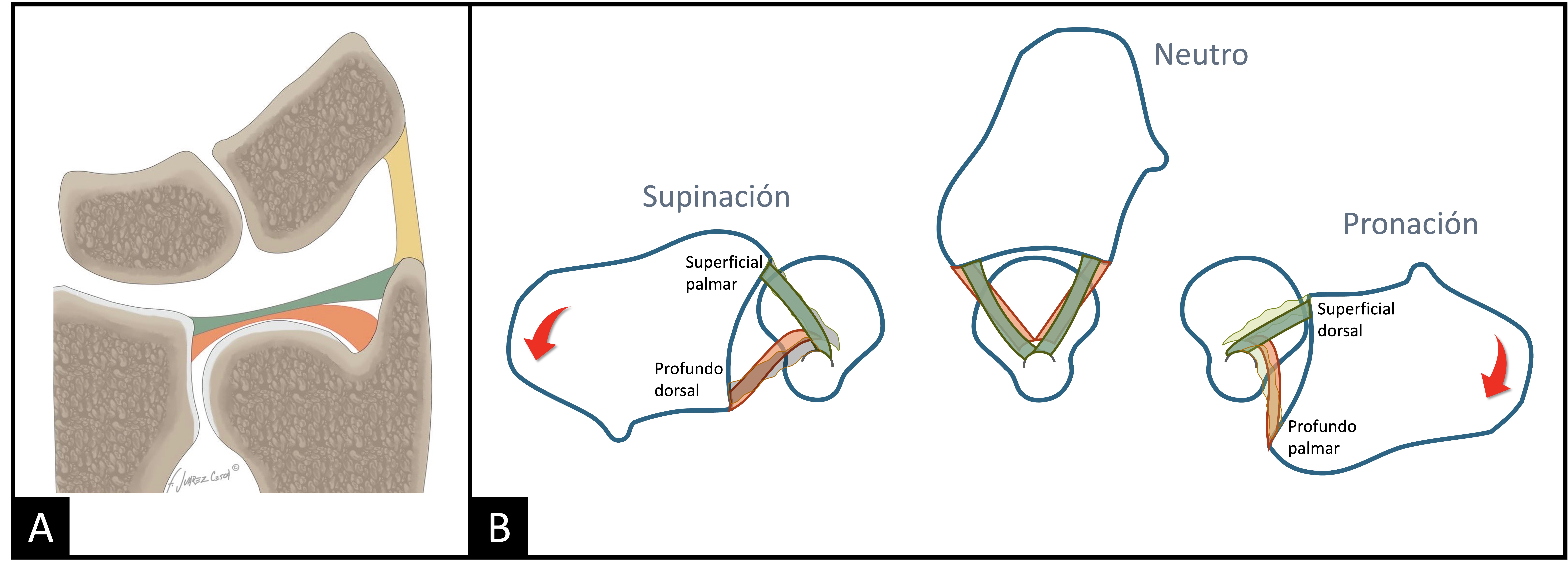 Figura 2. Anatomía y función de los ligamentos radiocubitales distales. A) Componente superficial (cd-CFCT: verde) y profundo (cp-CFCT: naranja) de los ligamentos radiocubitales dorsal y palmar. El cd-CFCT sostiene y suspende el carpo cubital como una hamaca, actúa como amortiguador y es responsable de la transmisión de carga en el lado cubital de la muñeca. El cp-CFCT consiste en el ligamento profundo que se inserta en la fóvea y funciona como el estabilizador principal de la articulación RCD. B) En supinación máxima se tensan las fibras superficiales palmares y profundas dorsales, mientras que en máxima pronación se tensan las fibras superficiales dorsales y profundas palmares.