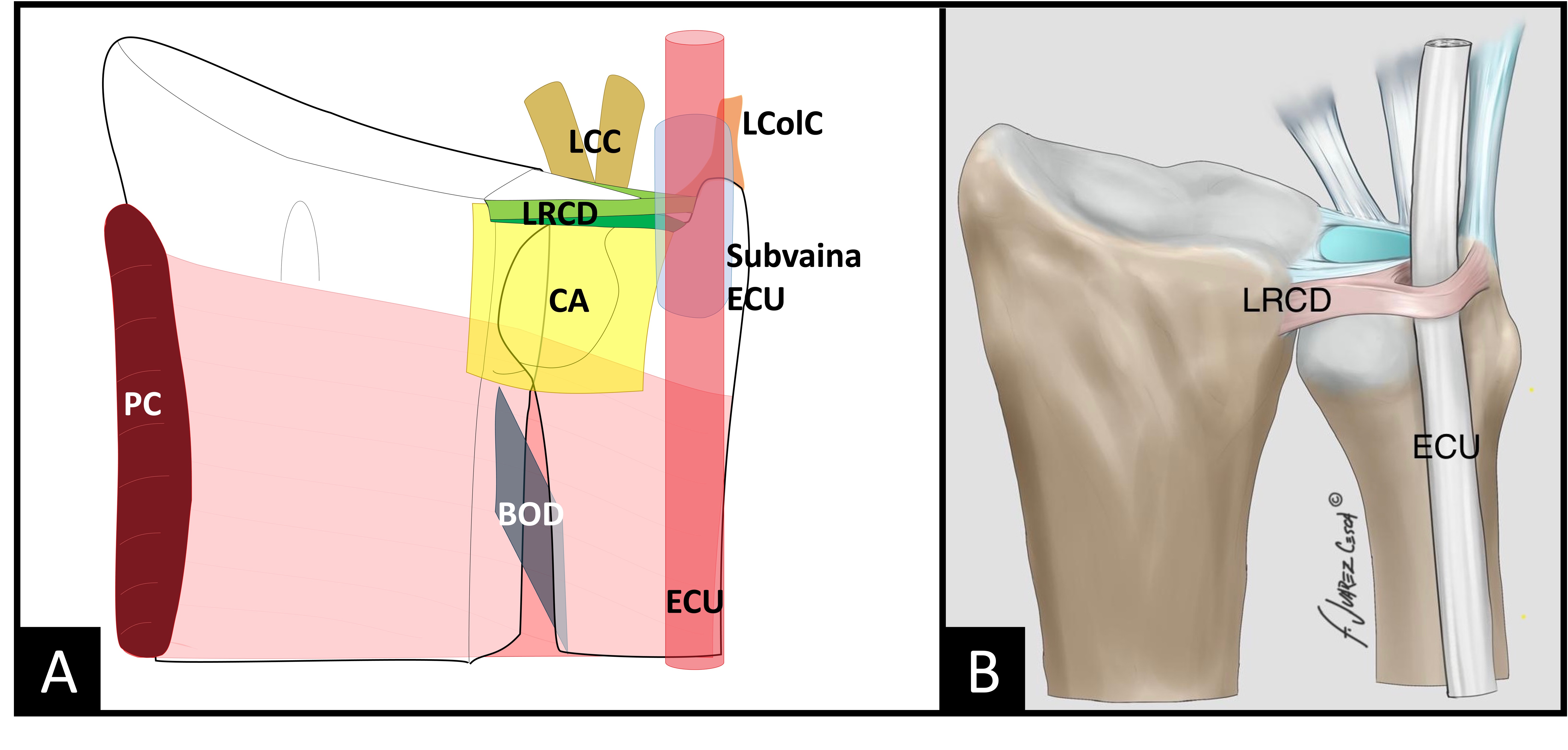 Figura 3. Estructuras estabilizadoras de la articulación RCD. A) Estabilizadores estáticos: fibras profundas de los ligamentos radiocubitales distales (LRCD), los ligamentos cubitocarpiano (LCC): cubitolunar y lunopiramidal, el ligamento colateral cubital (LColC), la subvaina del extensor cubital del carpo (sECU), la cápsula articular (CA) y la membrana interósea, especialmente su porción distal, denominada banda oblicua distal (BOD). Los estabilizadores dinámicos incluyen el extensor cubital del carpo (ECU) y el pronador cuadrado (PC). B) Relación anatómica del ligamento radiocubital distal dorsal con la subvaina del ECU, contribuyendo a la estabilidad RCD.