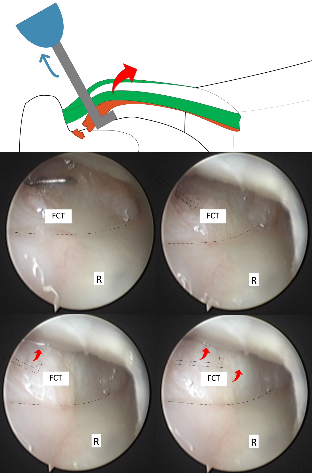 Figura 4. La prueba del gancho evalúa la tensión de las inserciones foveales del cp-CFCT mediante artroscopia radiocarpiana. Con el artroscopio en el portal 3/4, se introduce el palpador en el portal 6R y, por el receso preestiloideo, se aplica tracción al borde cubital del CFCT (la figura punteada representa el perfil del palpador el CFCT). Cuando las inserciones foveales están intactas, el disco central del CFCT no se puede elevar al tirar (prueba del gancho negativa). Cuando el cp-CFCT se desgarra o avulsiona, puede desplazarse hacia distal y el centro de la articulación radiocarpiana, considerando la prueba como positiva (secuencias progresivas de la vista artroscópica). R: radio.