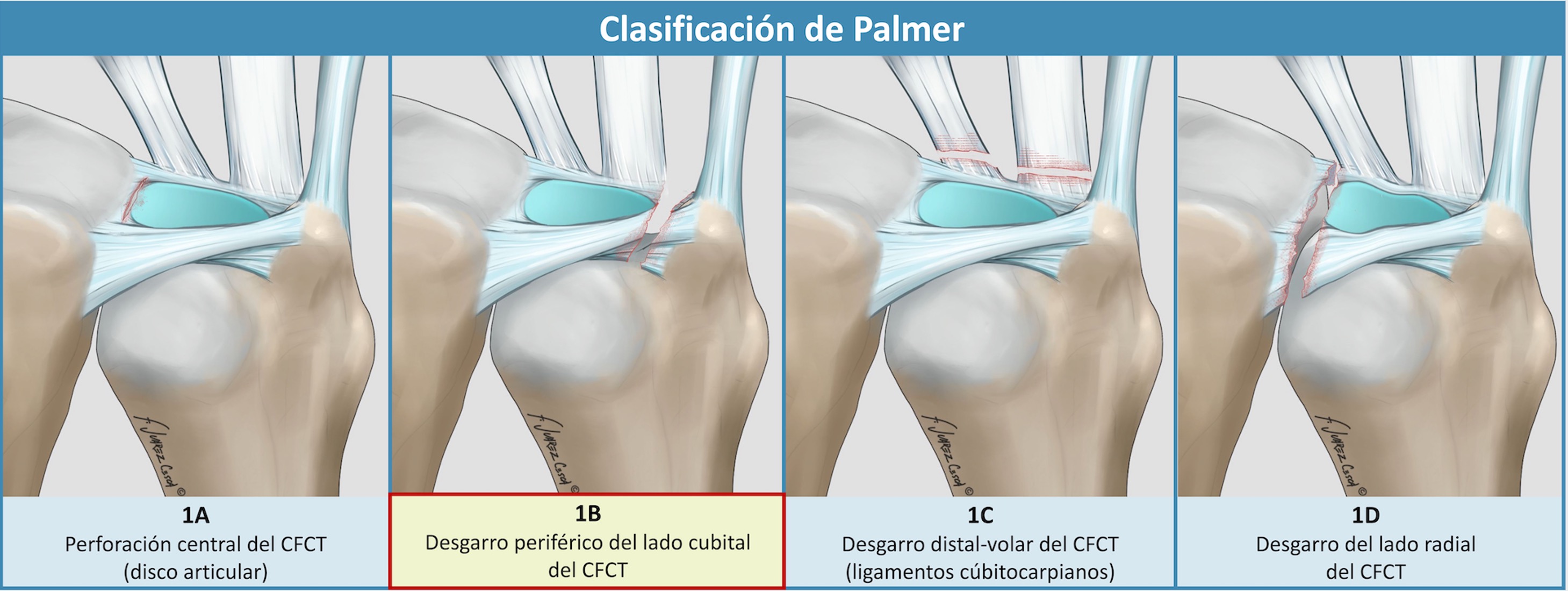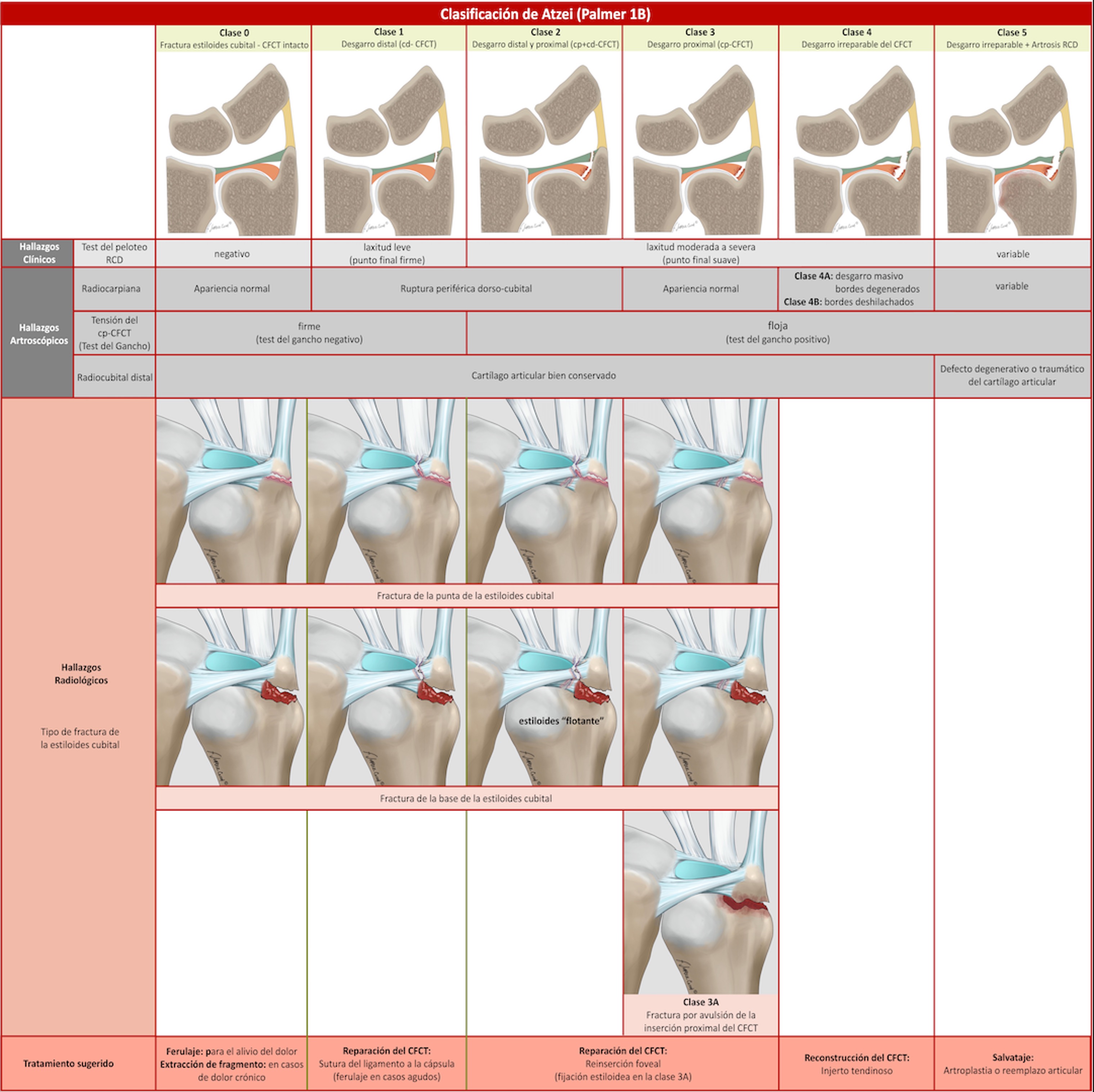- Clase 5: lesión del borde cubital del CFCT asociada a degeneración o degeneración condral significativa en la RCD. No se indica reparación ni reconstrucción; se opta por procedimientos paliativos como artroplastia de resección o prótesis.