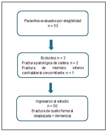 Los pacientes incluidos eran deambuladores, mayores de edad, presentaban una fractura medial de cadera grado III o IV de Garden y asociaban el diagnóstico de demencia previo a la internación (según los criterios del DSM-5 y con una puntuación en el Mini-Mental Test <18). Los criterios de exclusión fueron: fractura patológica secundaria a enfermedad maligna y fractura concomitante que requiriera cirugía.