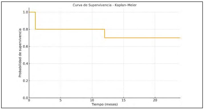 Los intervalos de confianza exactos (Clopper–Pearson, 95 %) para estas proporciones van de 0 a 6 %, por lo que no se puede excluir una tasa verdadera de hasta ≈ 6 %. La mortalidad fue de 20 % (10/50) a 1 mes (IC 95 %: 10–34 %) y 30 % (15/50) a 1 año (IC 95 %: 18–45 %) (Tabla 3) (Fig. 2). No se registraron otras pérdidas de seguimiento.