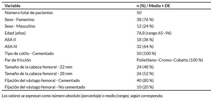 Ningún paciente experimentó luxación ni recibió cirugía de revisión durante el seguimiento. Tampoco se registraron casos de infección profunda. Diez pacientes fallecieron dentro de los primeros 30 días, con una tasa de mortalidad del 20 % (IC 95 %: 10–34 %). Al año, la mortalidad ascendió al 30 % (IC 95%: 18–45 %), con un total de 15 fallecimientos. El carácter retrospectivo y la incapacidad de evaluar los resultados funcionales (inherente a este grupo específico de pacientes) fueron las principales limitaciones del estudio.