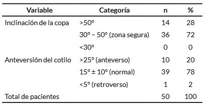 Tabla 2. Posición de la copa acetabular según los criterios de Lewinnek.