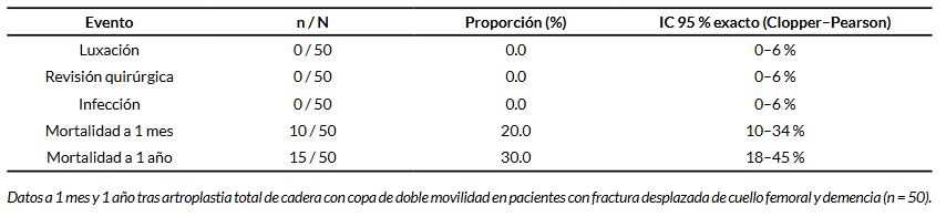 Describir las tasas de luxación, infección, mortalidad y reoperación a los 30 días y al año posteriores a una artroplastia total de cadera con cotilo de doble movilidad en pacientes con fractura del cuello femoral desplazada y demencia.