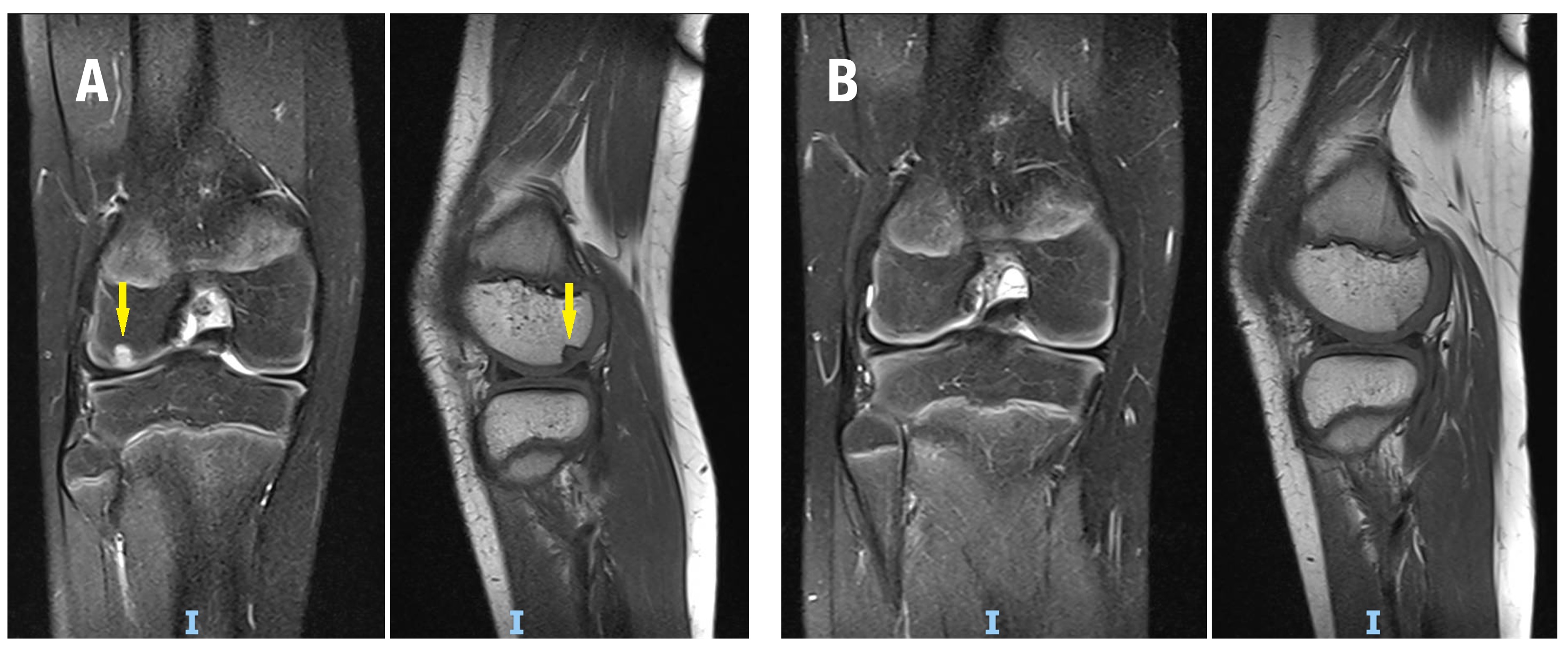Figura 1. Trasplante osteocondral autólogo en una paciente de 10 años con defecto osteocondral de cóndilo femoral externo. A) Imagen preoperatoria de RNM DPFS (coronal) y T1 (sagital) donde se observa el defecto (flecha amarilla). B) RNM DPFS (coronal) y T1 (sagital) a los 6 meses, se observa incorporación completa del injerto.