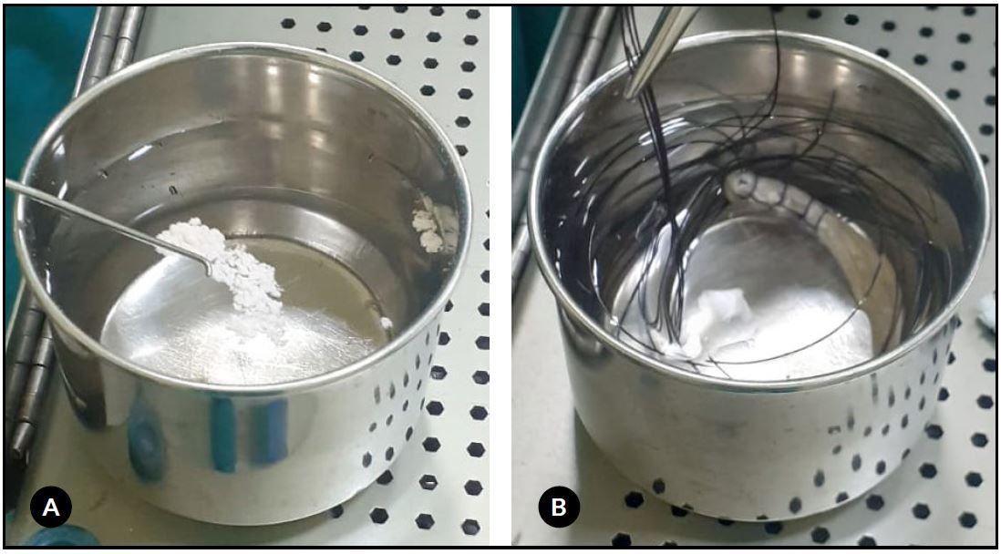 Figura 1. A) Dilución de 1 g de vancomicina en 200 cc de solución fisiológica. B) Colocación de injertos ST-RI cuádruples durante 10 minutos.