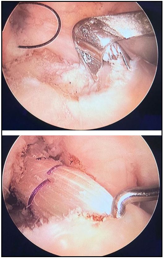 En ambos grupos se utilizó la misma técnica quirúrgica, a través del portal anteromedial para emplazar el túnel femoral, intentando replicar una reconstrucción anatómica (Fig 2). Luego de pasar el injerto a través de los túneles, fueron fijados con 2 tornillos interferenciales con rosca roma; tornillos de titanio, de PEEK o de biocompuesto (según provisión por parte de cobertura social del paciente). Al finalizar la artroscopia, se utilizó la solución fisiológica (con vancomicina, o sin esta) para lavar la incisión de toma de injerto. Cierre de herida por planos.