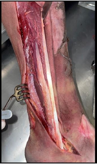 Figura 2. Anatomía del tendón peroneo lateral largo en una disección cadavérica. Se observa su trayecto distal hacia proximal con su relación con las estructuras vecinas en la cara lateral de la pierna. Se observa la longitud obtenida habitualmente para su uso como injerto.