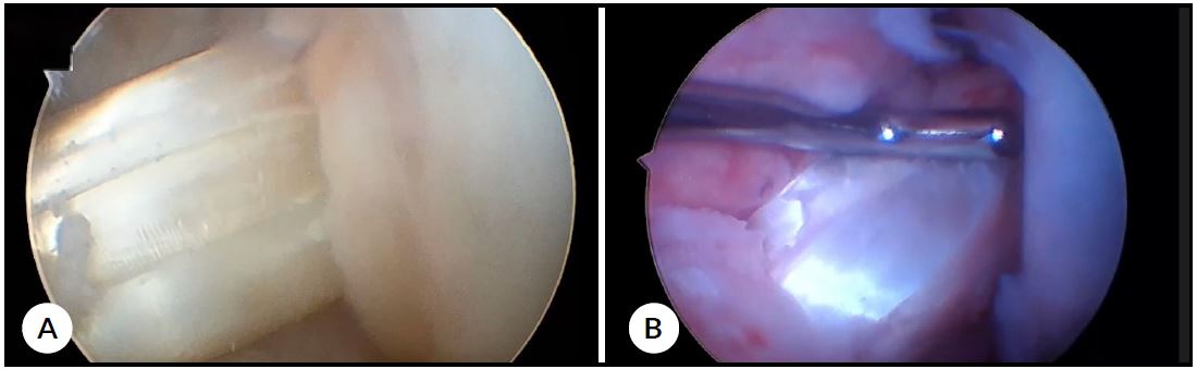 Figura 3. Imágenes intraoperatorias de reconstrucciones del LCA en pacientes de distinto sexo. A) Hombre. B) Mujer. Si bien en las imágenes no son apreciables las diferencias entre hombres y mujeres, en nuestra serie se registraron valores mayores en varones que en mujeres (p < 0.05).